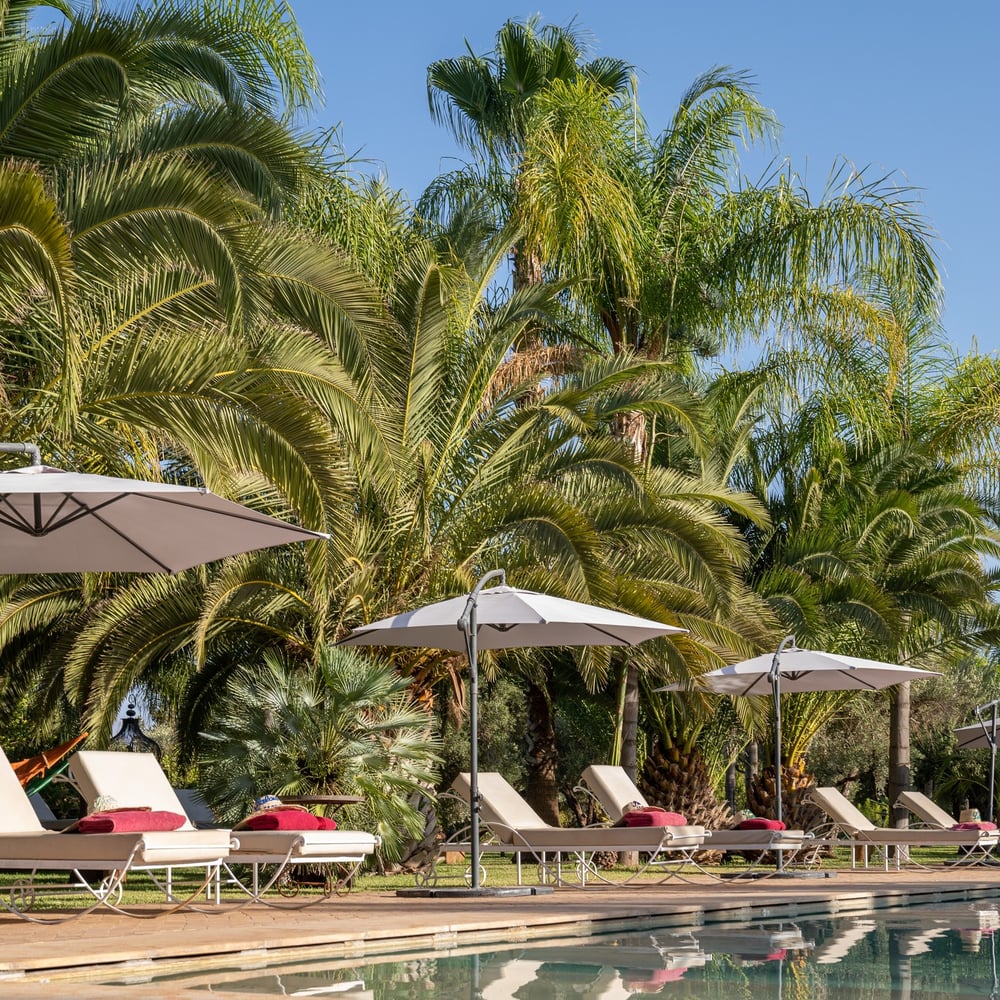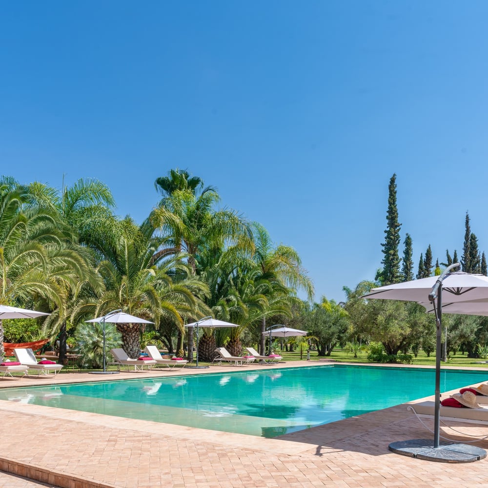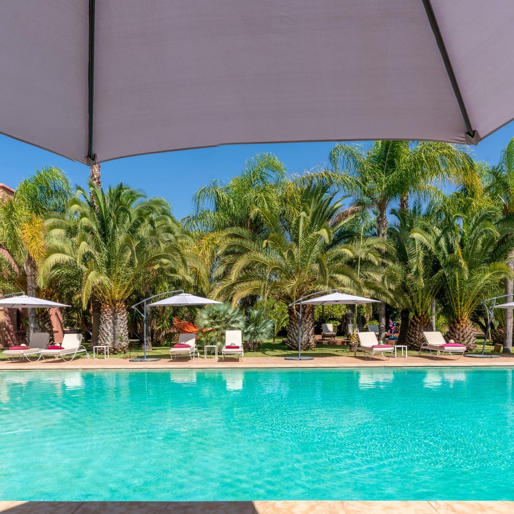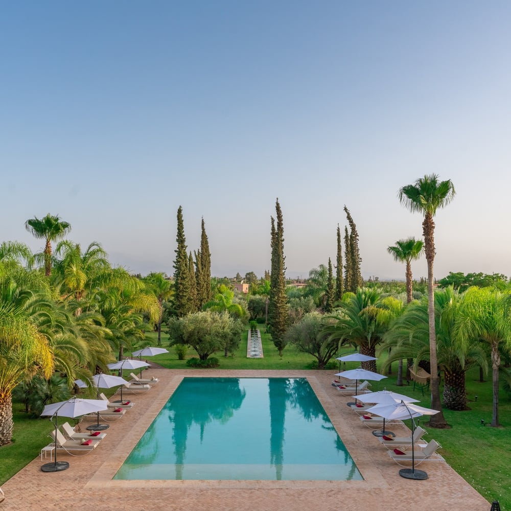 يقع قصر حسون في مساحة خضراء تمتد على 2 هكتار، ويتميز بأشجارها المهيبة مثل أشجار الزيتون والنخيل وأشجار السرو الطويلة. يوفر هذا الملاذ الهادئ للضيوف بيئة هادئة، مثالية للاسترخاء. يضم مسبحًا بمساحة 180 متر مربع (9 × 20 متر) وبركة زينة طولها 20 مترًا تحتوي على زهور الزنبق ونوافير المياه. يُضاء المنتزه في المساء، مما يخلق جوًا رومانسيًا.