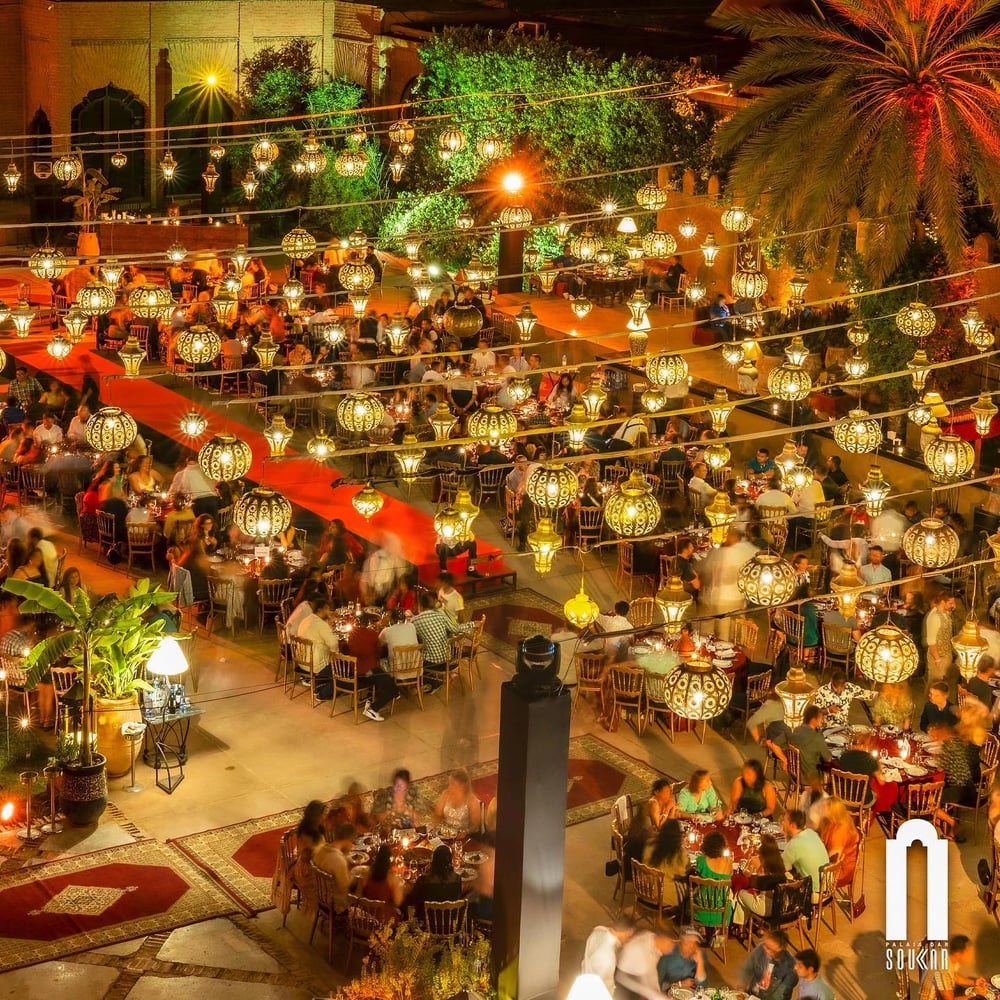 The venue is divided into two areas: an elegant indoor space with a restaurant, lounge, and covered terrace, and a 1200 m² outdoor terrace. It can accommodate up to 1,800 people for a seated dinner and 2,500 for cocktail receptions, making it ideal for large events. With its stunning architecture and versatile spaces, Dar Soukkar is a top choice for memorable events in Marrakech.