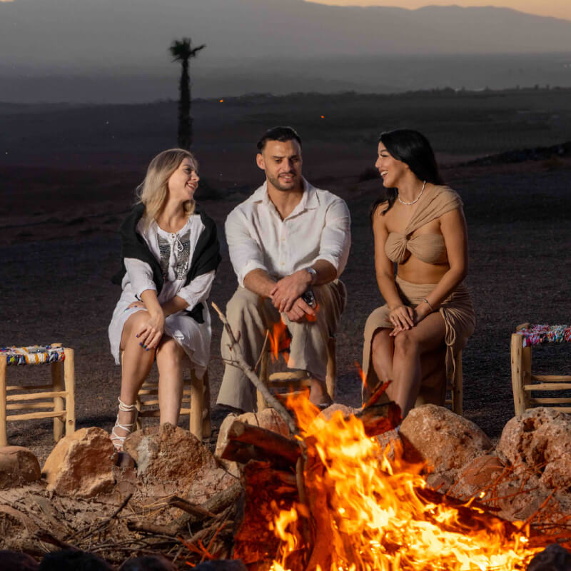 Nestled near the Agafay Desert, the camp is located on the other side of Agafay, 7km from the Lalla Takerkoust Dam. The landscape is stunningly desert-like, with breathtaking reliefs almost identical to those of Agafay. The camp blends luxury with authenticity, offering traditional Moroccan cuisine crafted from fresh, local ingredients.
