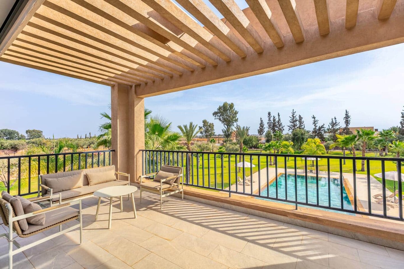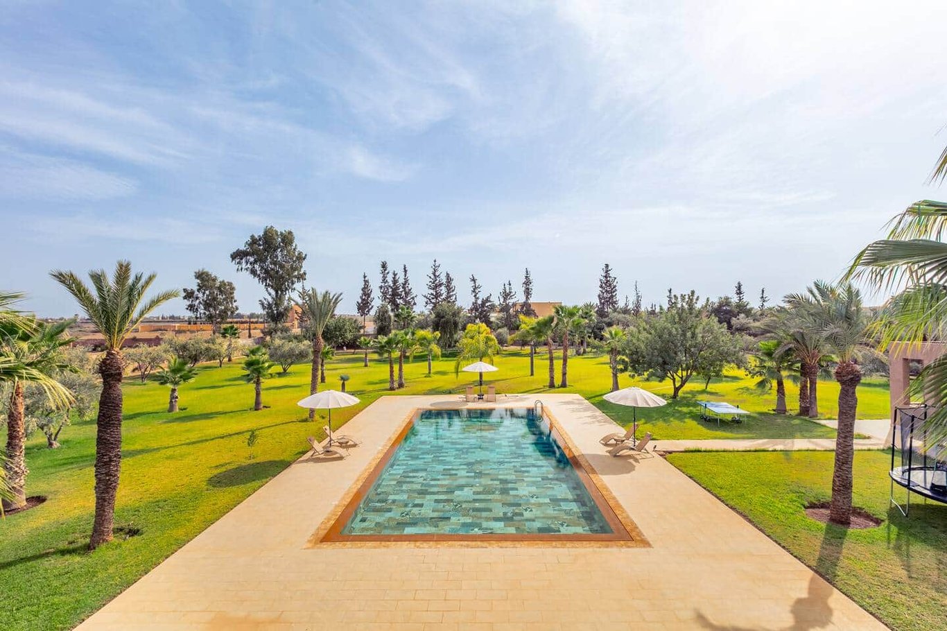 Outdoors, the property offers a large private swimming pool measuring 15 × 9 meters with no overlooking, surrounded by nature and open views of the Atlas. Dedicated wellness and leisure spaces complete the experience, making the villa a true retreat just outside Marrakech.
